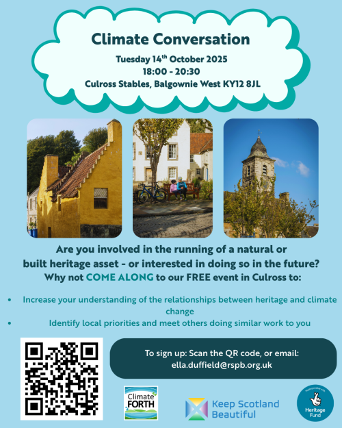 This Climate Conversation session, hosted by Keep Scotland Beautiful and Climate FORTH, provides an opportunity for community groups and individuals to learn about the relationship between heritage and climate change, considering the climate mitigation of built, natural and cultural heritage, and actions which can be taken within a local context. These sessions are open to any level of environmental knowledge, and will provide a chance to connect with other individuals in the area.