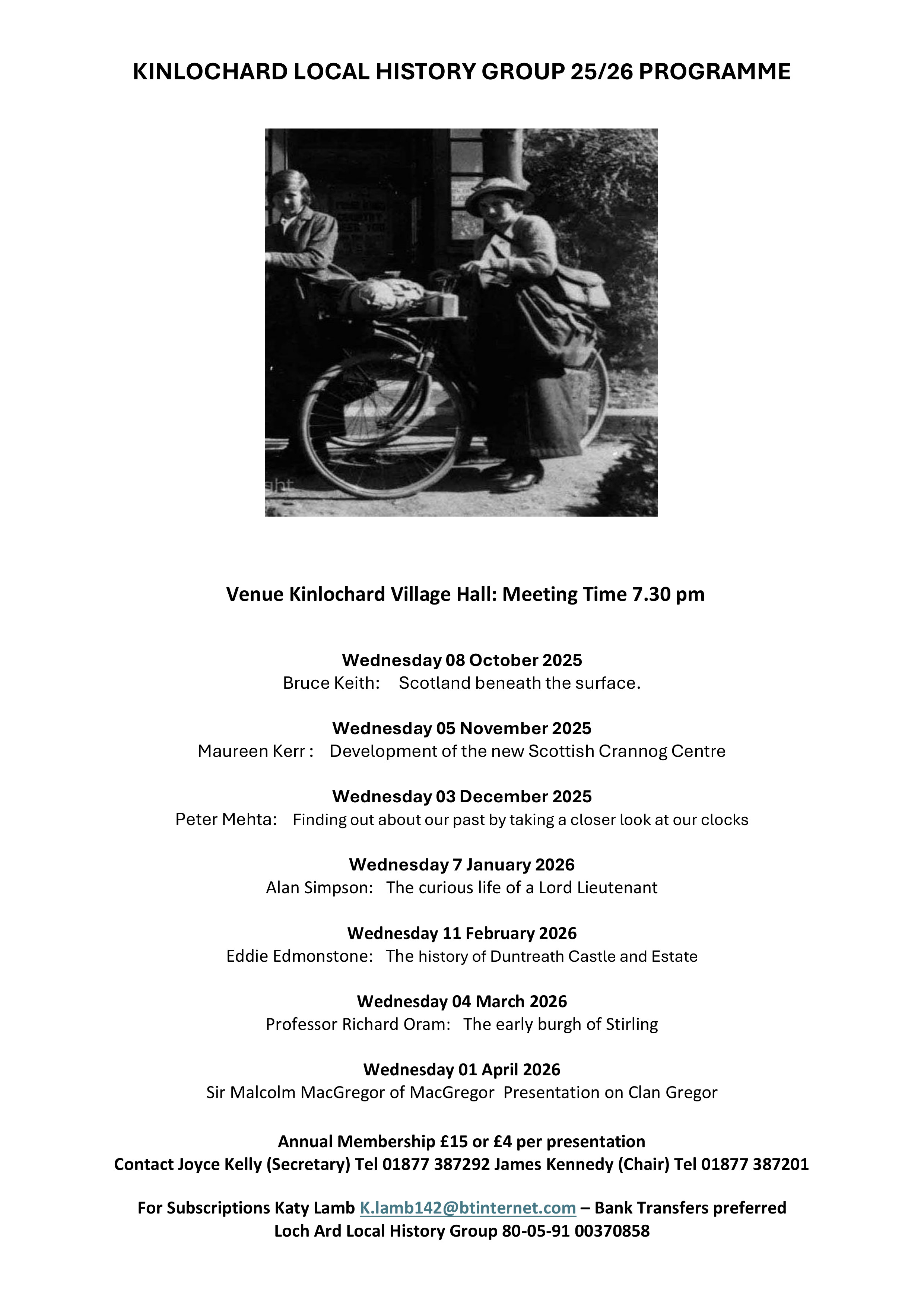 Loch Ard Local History Group meetings continue to be held in Kinlochard Village Hall starting at 7.30 pm usually on the first Wednesday of each month. The exception is January when the meeting is held on the 2nd Wednesday. Please check our programme to be certain!
