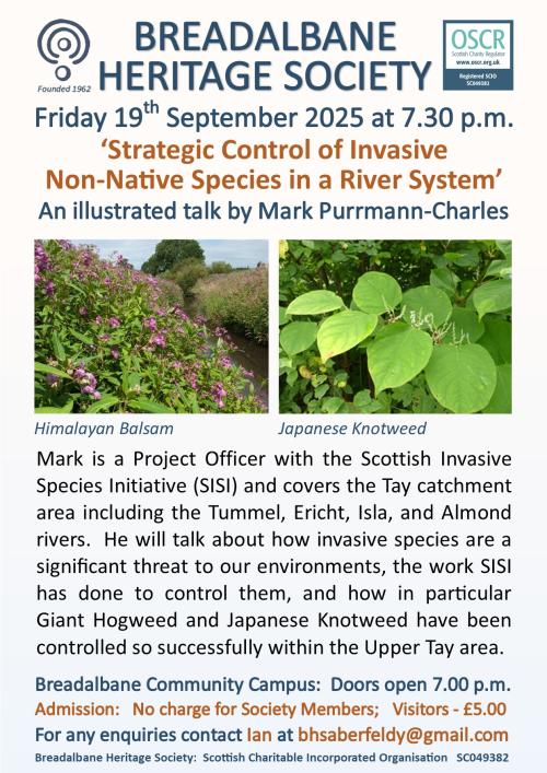 Mark Purrmann-Charles, Project Officer with the Scottish Invasive Species Initiative (SISI) will be talking about "Strategic Control of a non-native Species in a River System" .